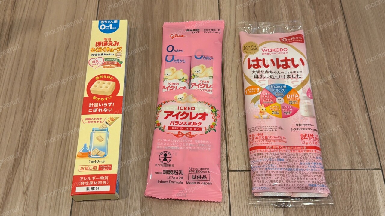 左から 明治ほほえみらくらくキューブ 200ml分、アイクレオバランスミルク 2本(200ml分)、はいはい 2本(200ml)分です。