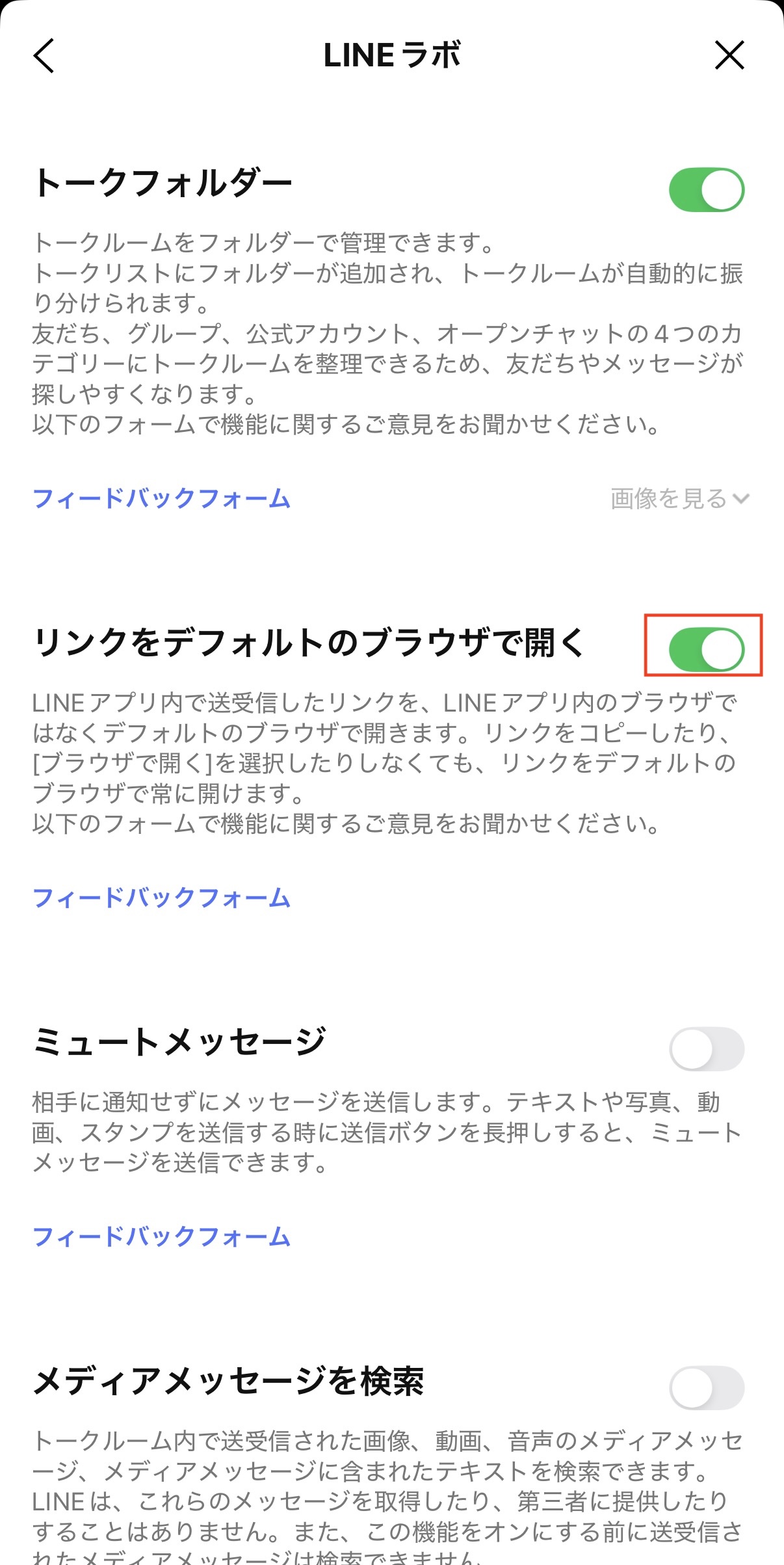 「リンクをデフォルトのブラウザで開く」をONにする