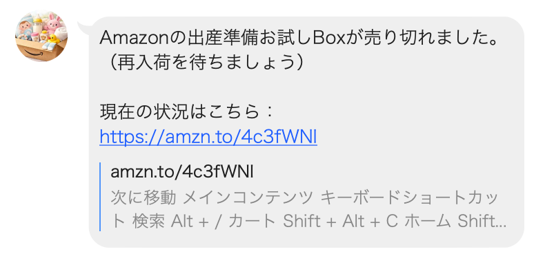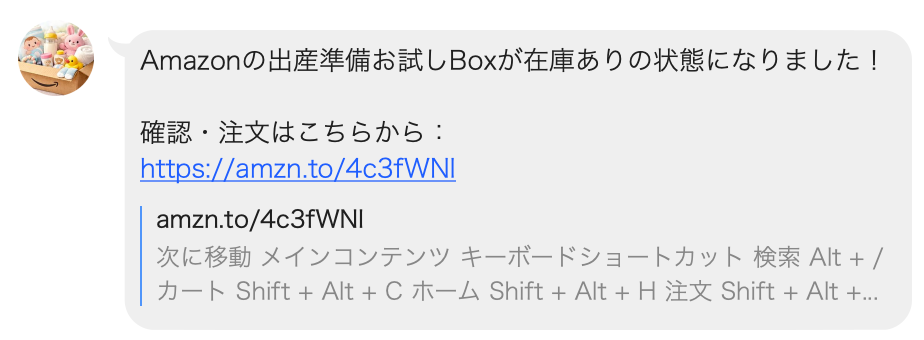 ということで、今回はAmazonの「らくらくベビー 出産準備お試しBox」の通知Botの紹介でした。