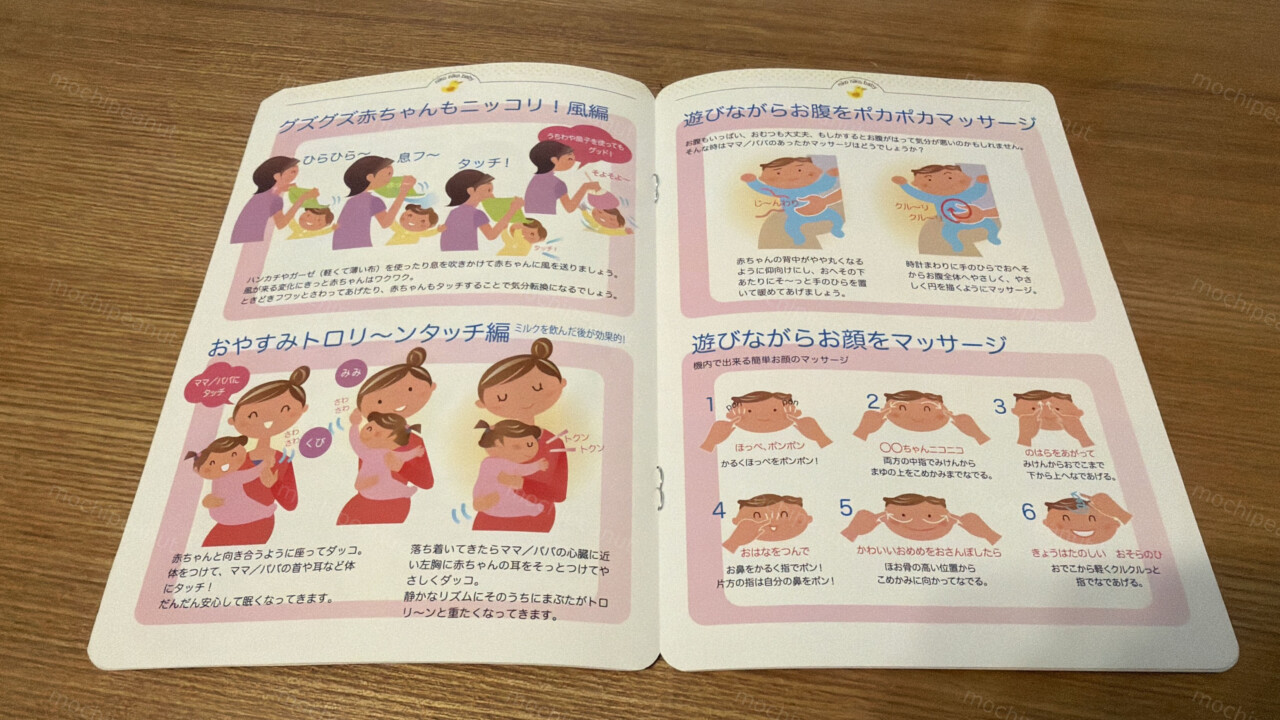 中には赤ちゃん向けのマッサージの方法や、赤ちゃんが見て楽しめる絵本のような内容もありました。